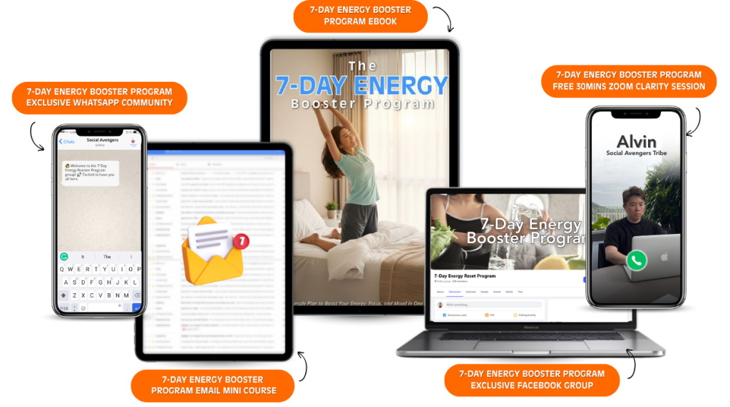 When you join the 7-Day Energy Booster Program, you’re not signing up for another funnel. You’re getting a clear, stress-free plan with real support made for busy people who want steady, lasting energy. You’ll receive the 7-Day Energy Booster Program eBook, the 7-Day Email Mini-Course, a free 1-on-1 clarity consult, plus access to our exclusive WhatsApp and Facebook groups for encouragement, accountability, and community all at no cost.