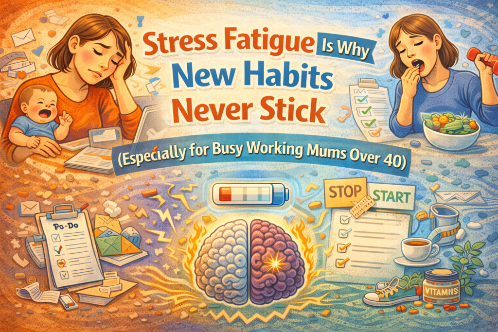 Stress fatigue is one of the main reasons new habits feel impossible for working mums over 40, especially those managing high blood pressure, high cholesterol, or high blood sugar. Stress fatigue drains energy quietly, making even small changes feel heavy.